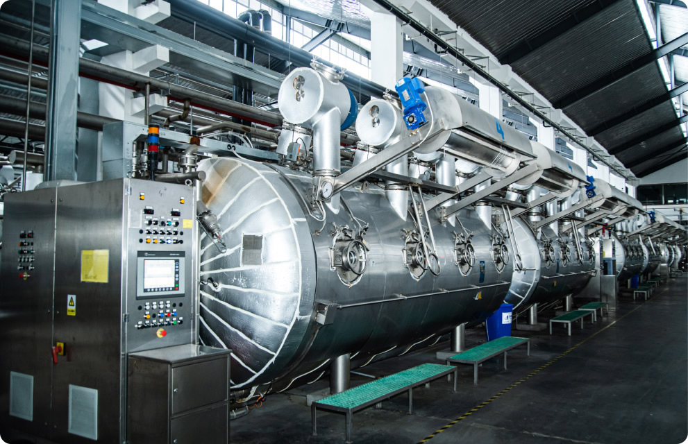 Annual capacity of 108 million meters of fabrics. Equipped with full-process dyeing and finishing equipment for pretreatment, dyeing, and post-finishing: