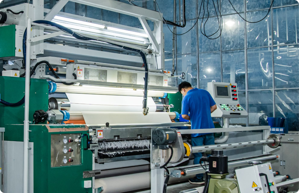 Main equipment: 4 laminating machines (Xin Qiang, Taiwan) and 2 embossing machines.