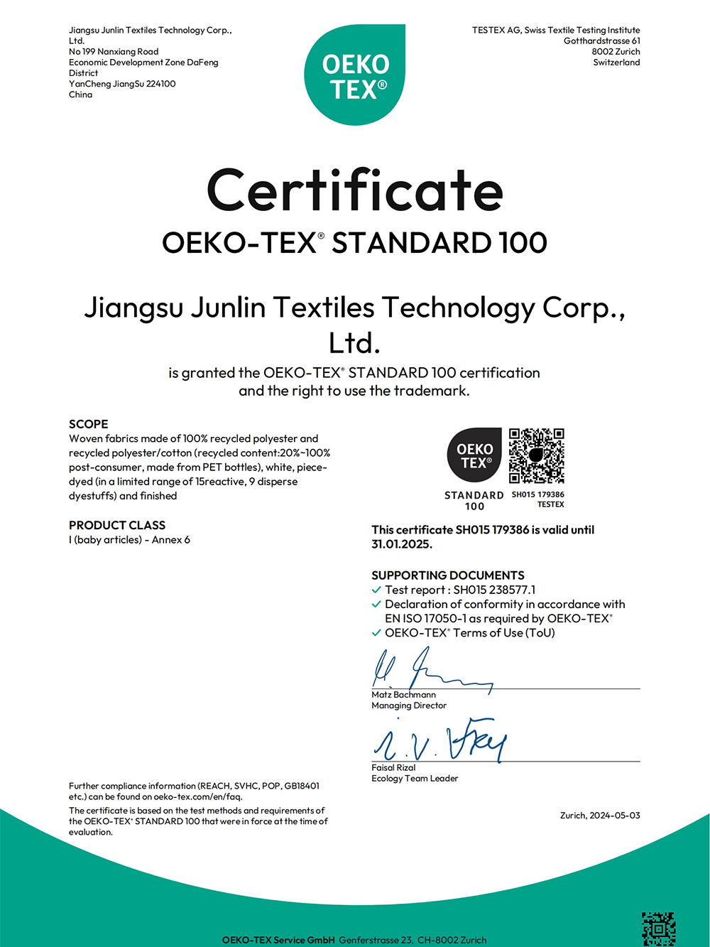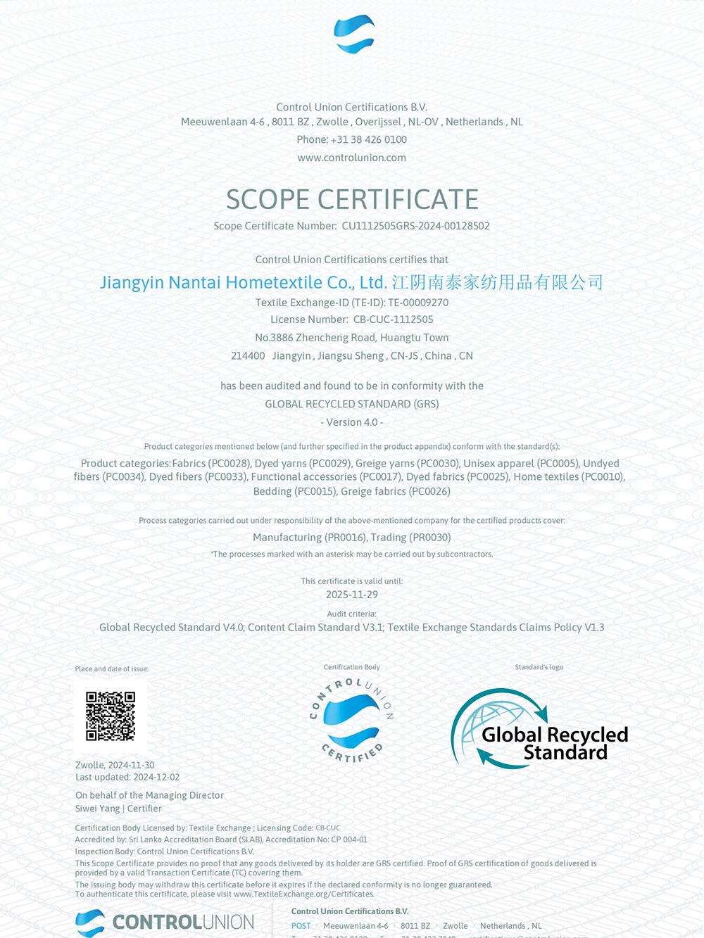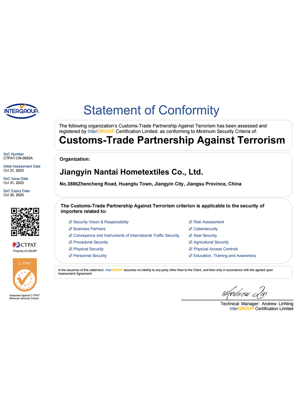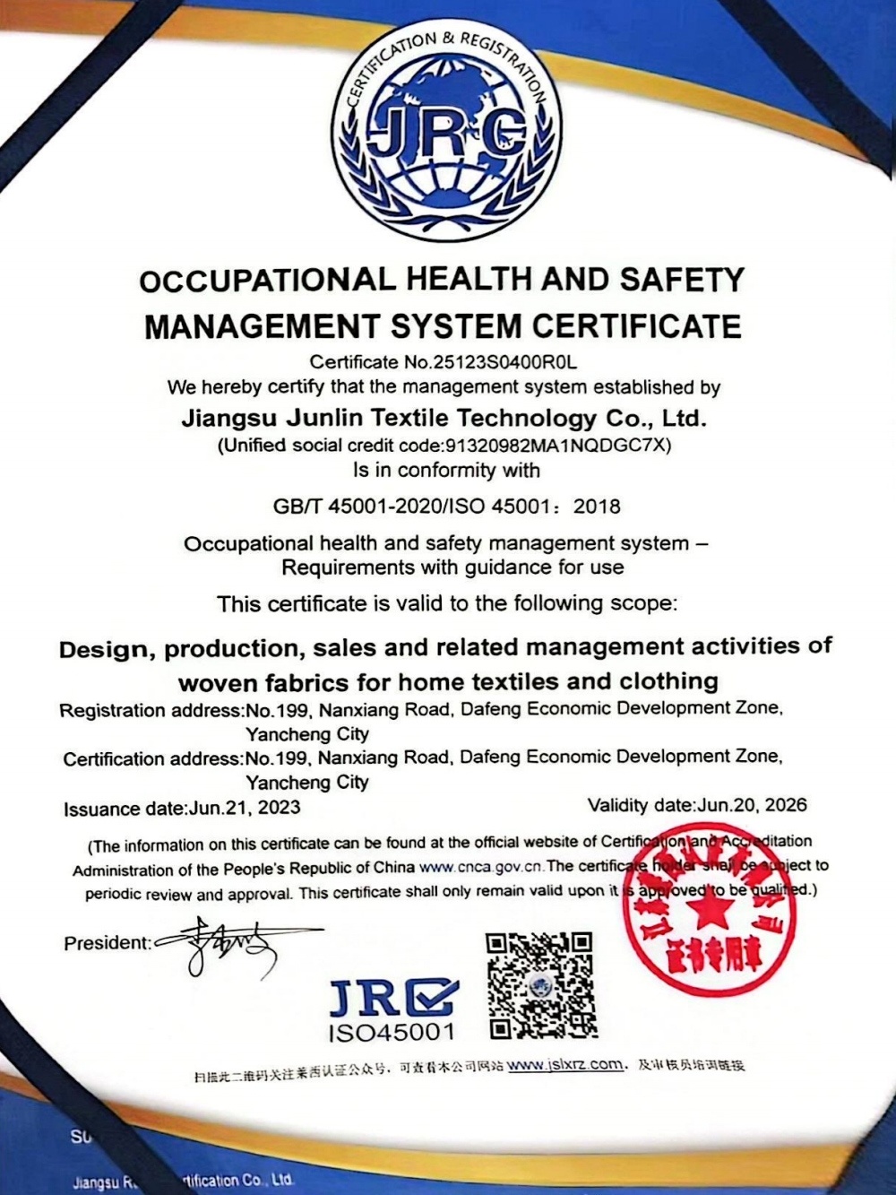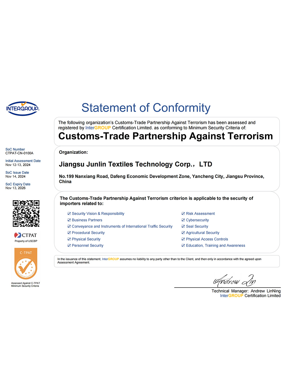 As a multi-category textile manufacturer spanning domestic and international markets, our Group has established a dual certification system covering both domestic and global standards. Domestically, we strictly adhere to the three management system standards: ISO 9001 Quality Management System, ISO 14001 Environmental Management System, and ISO 45001 Occupational Health and Safety Management System, ensuring products comply with GB/T national standards. Internationally, we have obtained certifications including GRS (Global Recycled Standard) for recycled polyester, SC-OCS (Organic Content Standard) for organic cotton, OEKO-TEX® STANDARD 100, HIGG INDEX (Social Responsibility), HIGG FEM (Environmental Management), and C-TPAT. These certifications demonstrate our commitment to providing trustworthy products and services, highlighting strengths in environmental protection, safety, sustainable development, and green supply chain management.