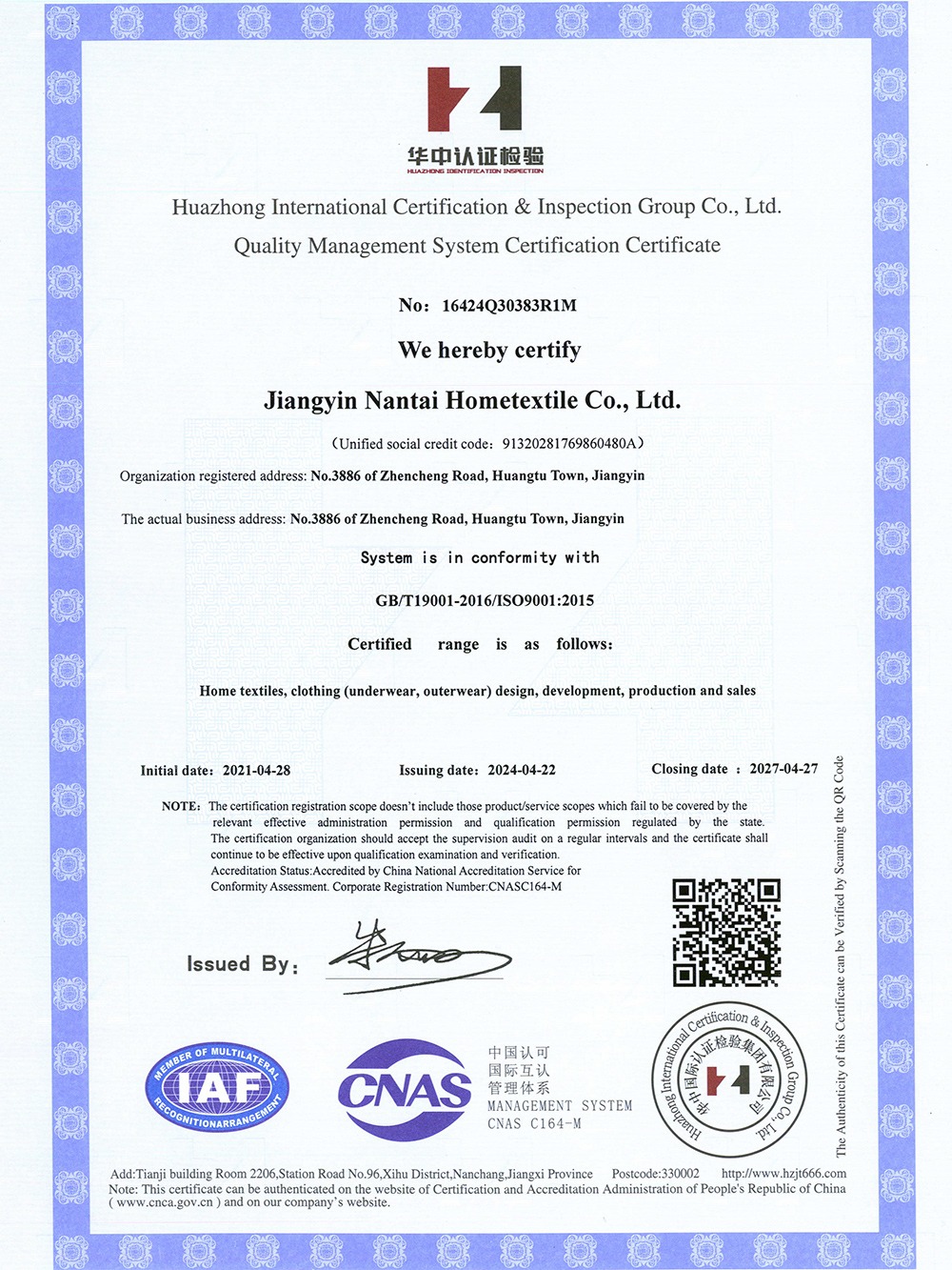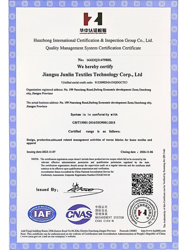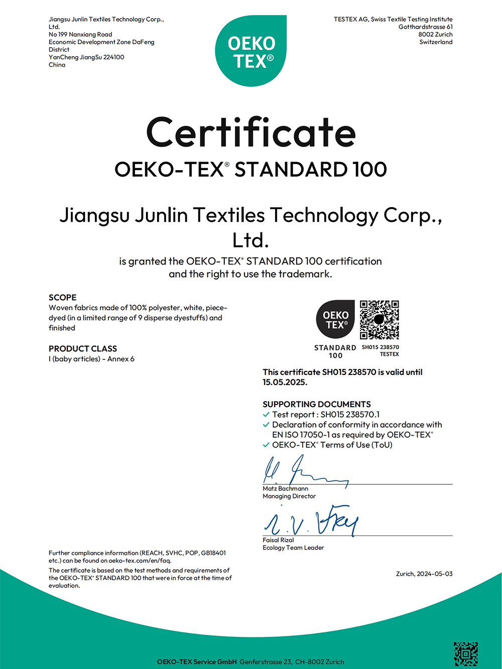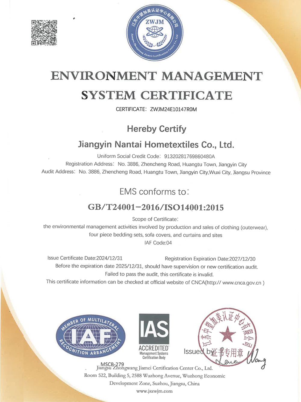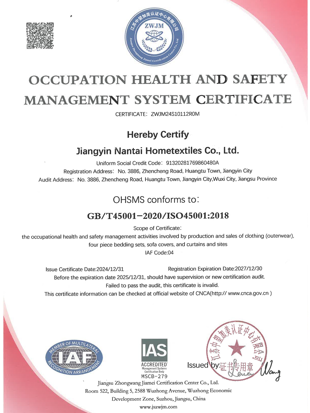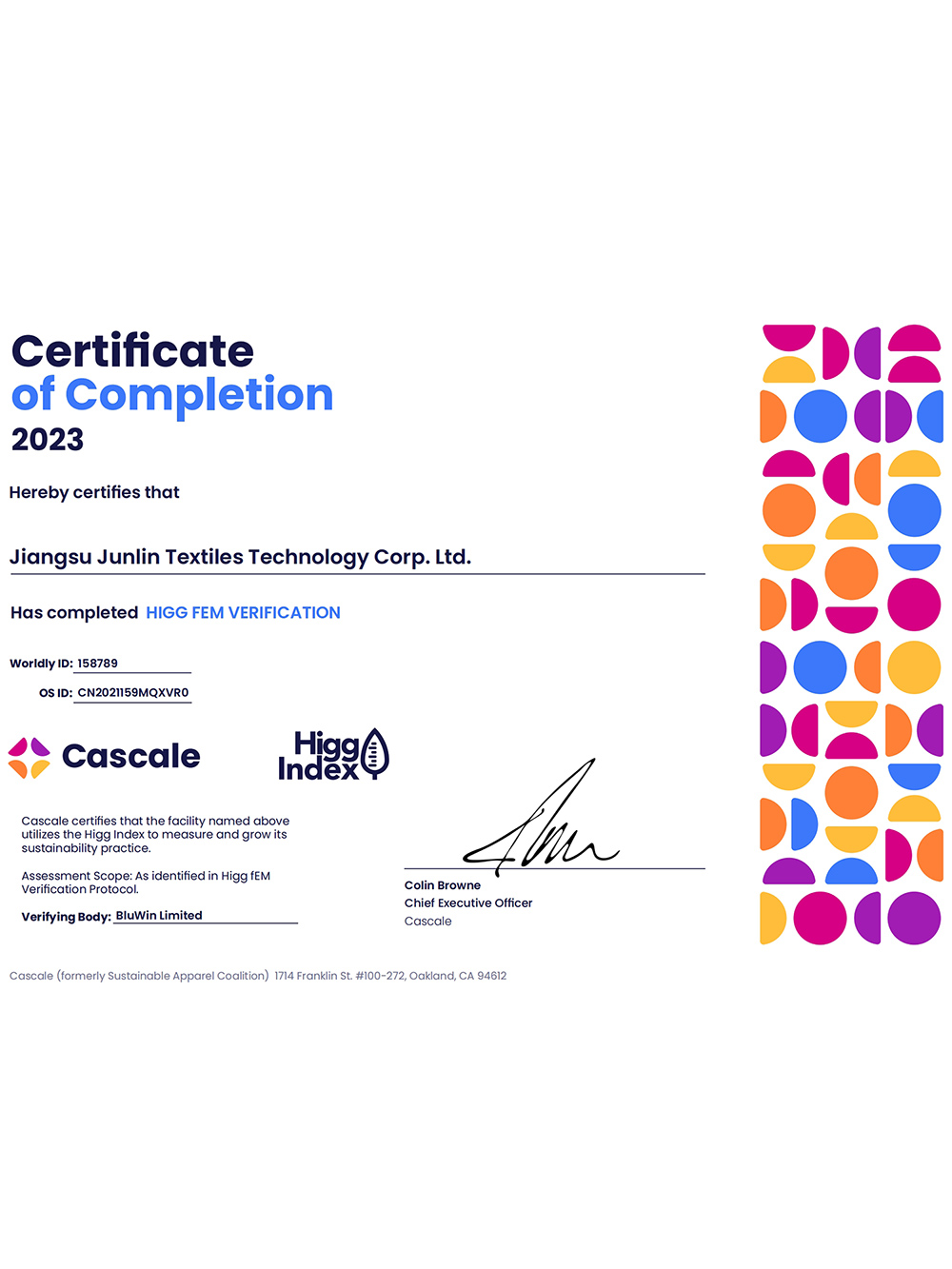 As a multi-category textile manufacturer spanning domestic and international markets, our Group has established a dual certification system covering both domestic and global standards. Domestically, we strictly adhere to the three management system standards: ISO 9001 Quality Management System, ISO 14001 Environmental Management System, and ISO 45001 Occupational Health and Safety Management System, ensuring products comply with GB/T national standards. Internationally, we have obtained certifications including GRS (Global Recycled Standard) for recycled polyester, SC-OCS (Organic Content Standard) for organic cotton, OEKO-TEX® STANDARD 100, HIGG INDEX (Social Responsibility), HIGG FEM (Environmental Management), and C-TPAT. These certifications demonstrate our commitment to providing trustworthy products and services, highlighting strengths in environmental protection, safety, sustainable development, and green supply chain management.
