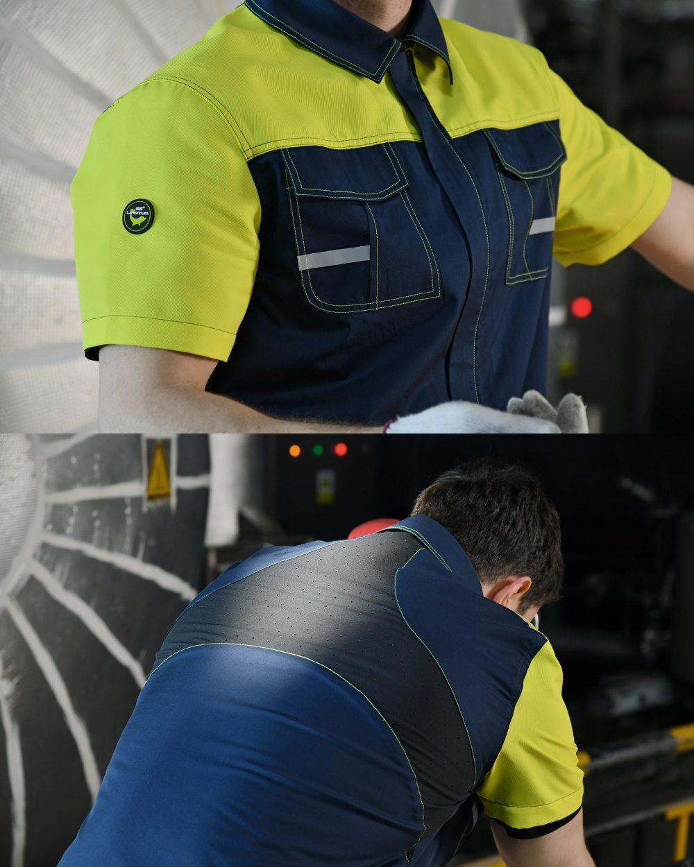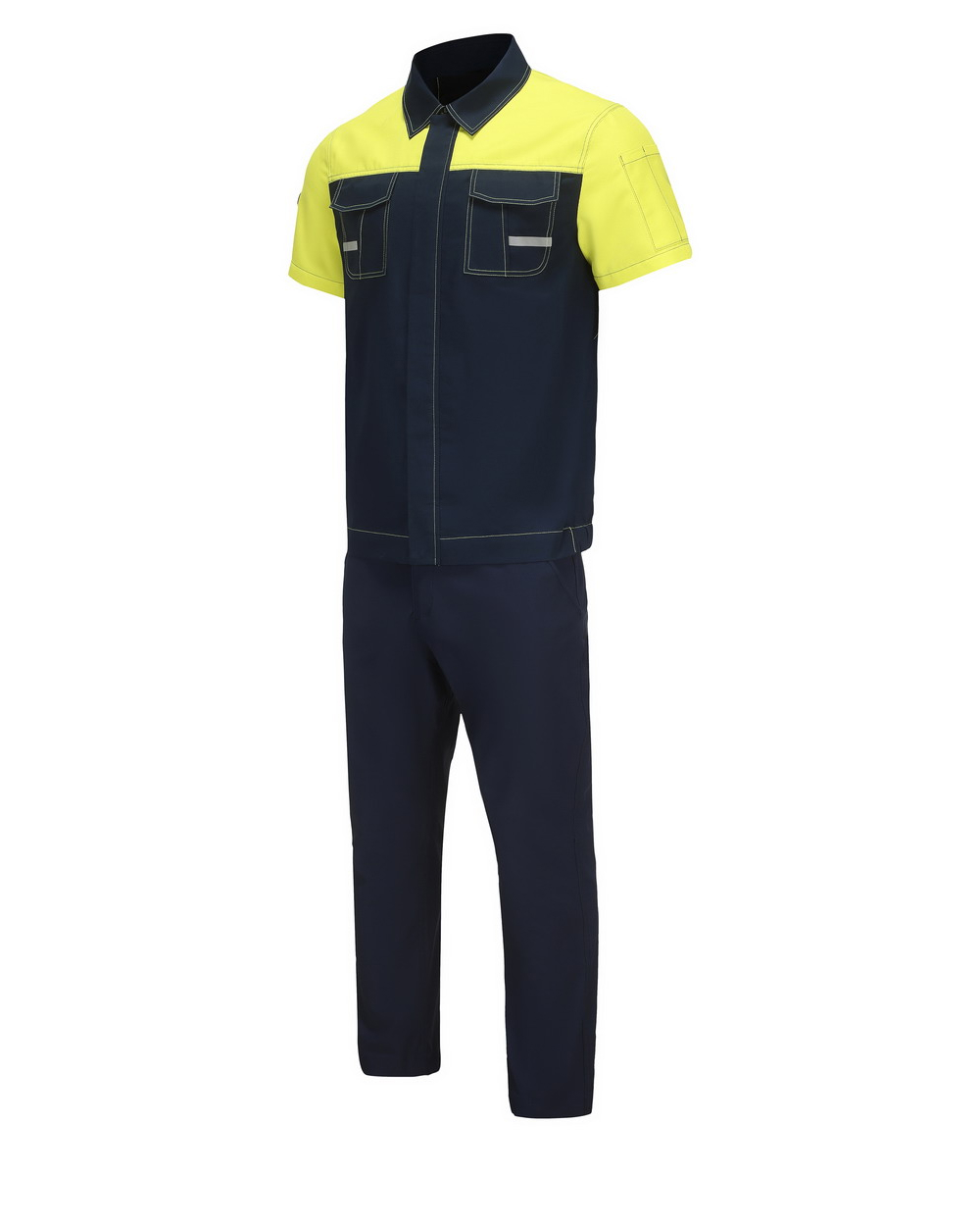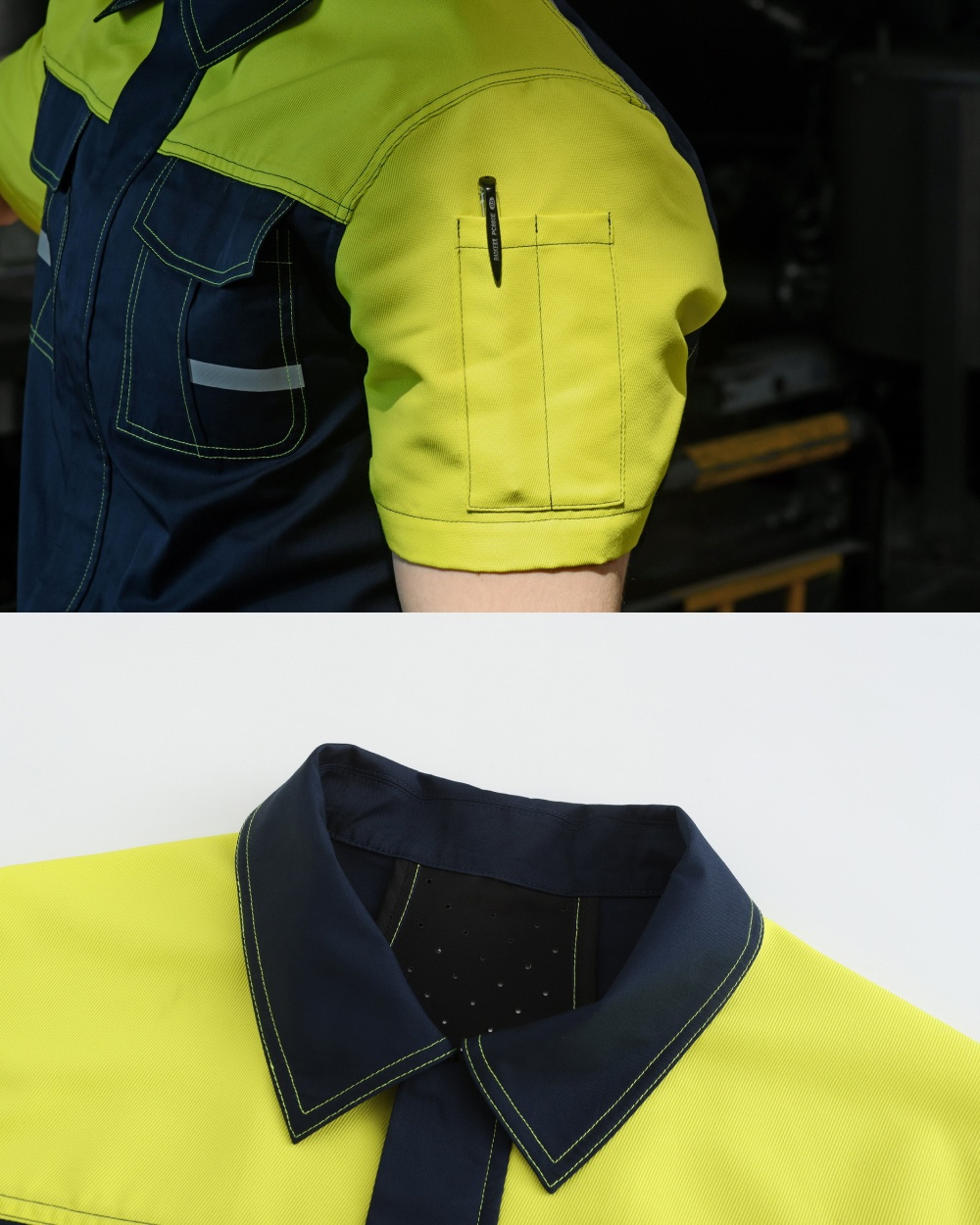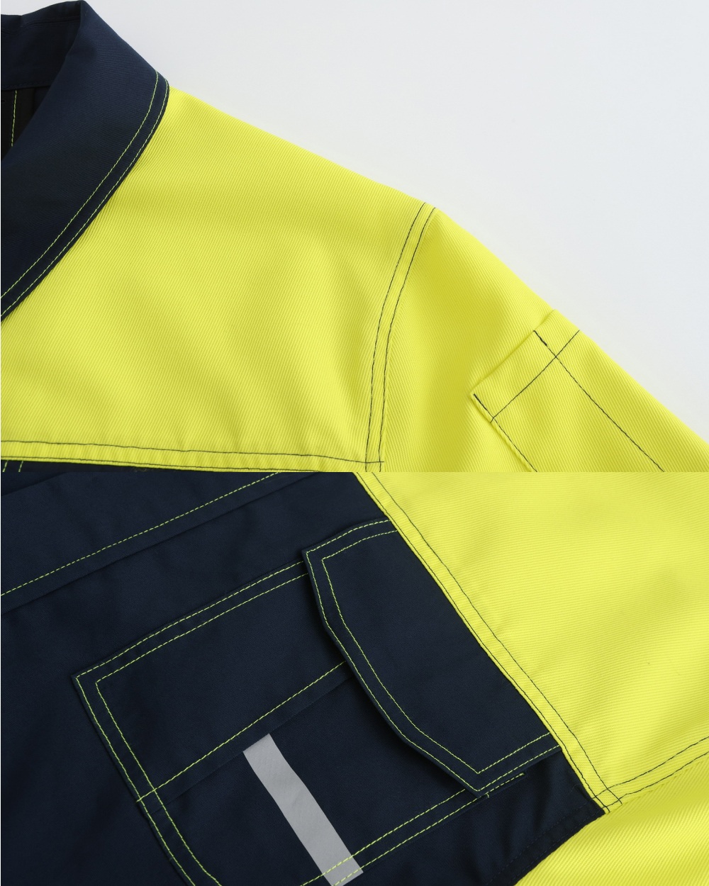 2. 3M reflective strips on shoulders and chest; Contrast-color lapel design adds a modern, stylish edge; Twin flap chest pockets and a sleeve pocket meet daily work needs; 3D sleeve label for a refined look