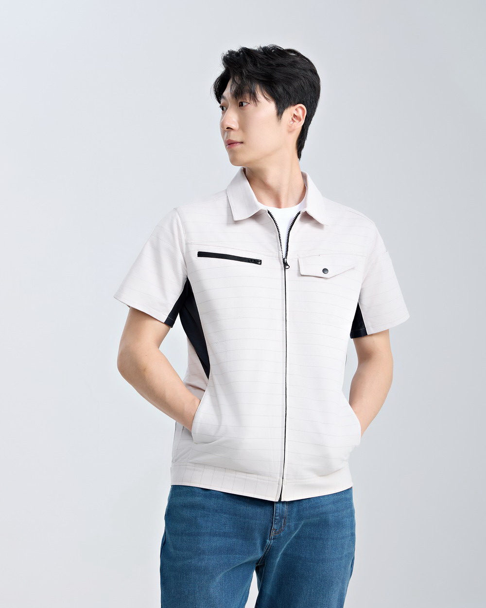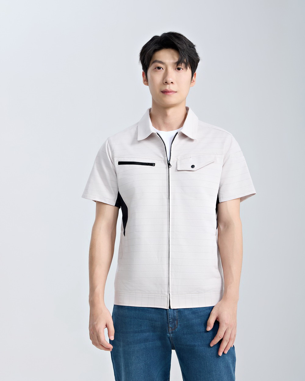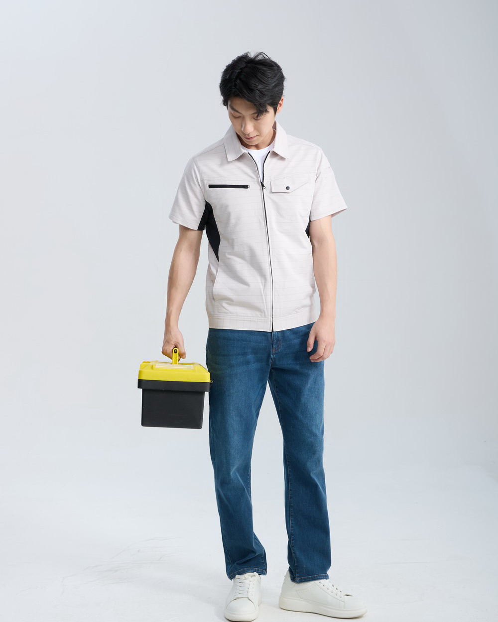 4. A zippered chest pocket and a flap pocket, a sleeve pocket for tools, underarm contrast color design