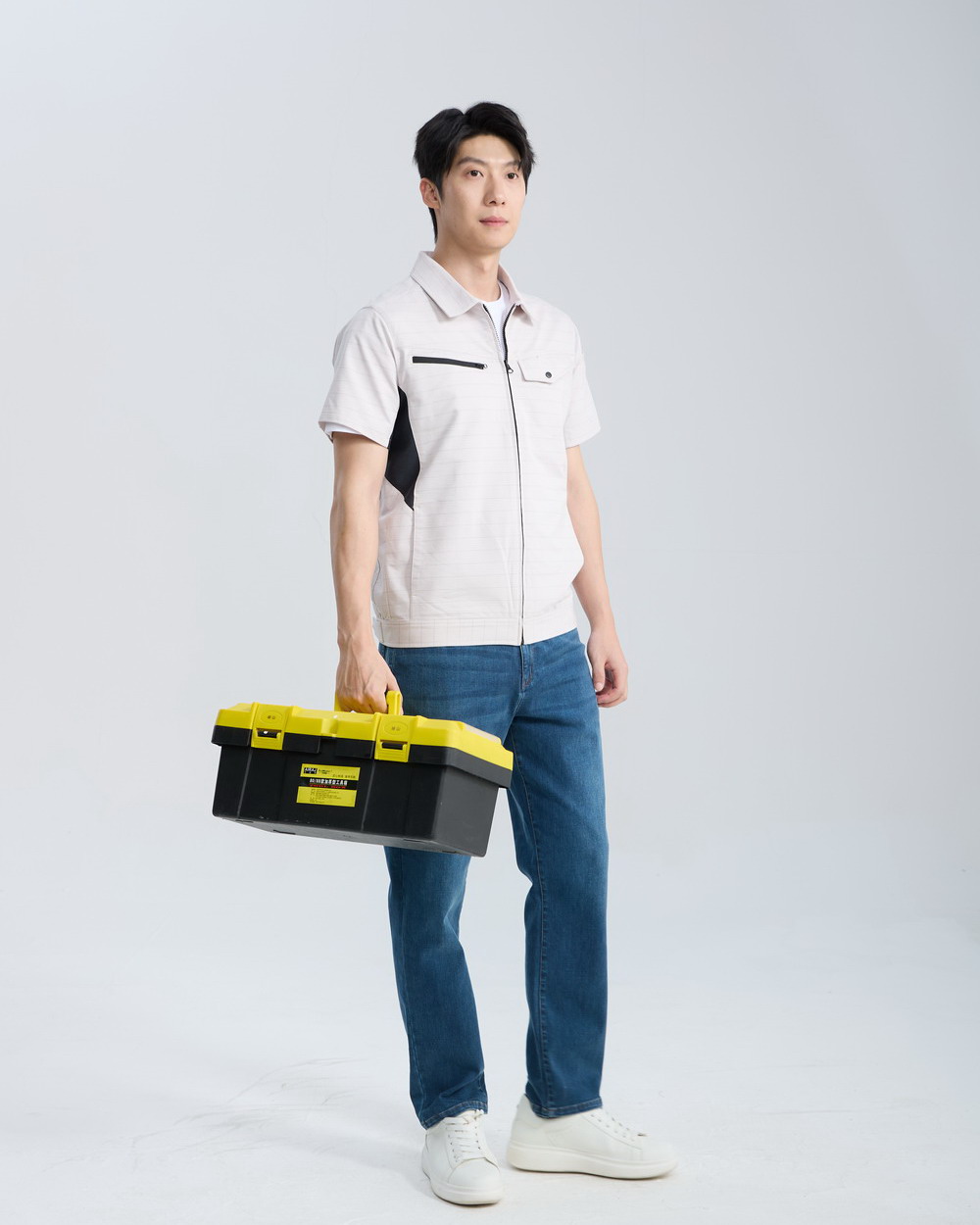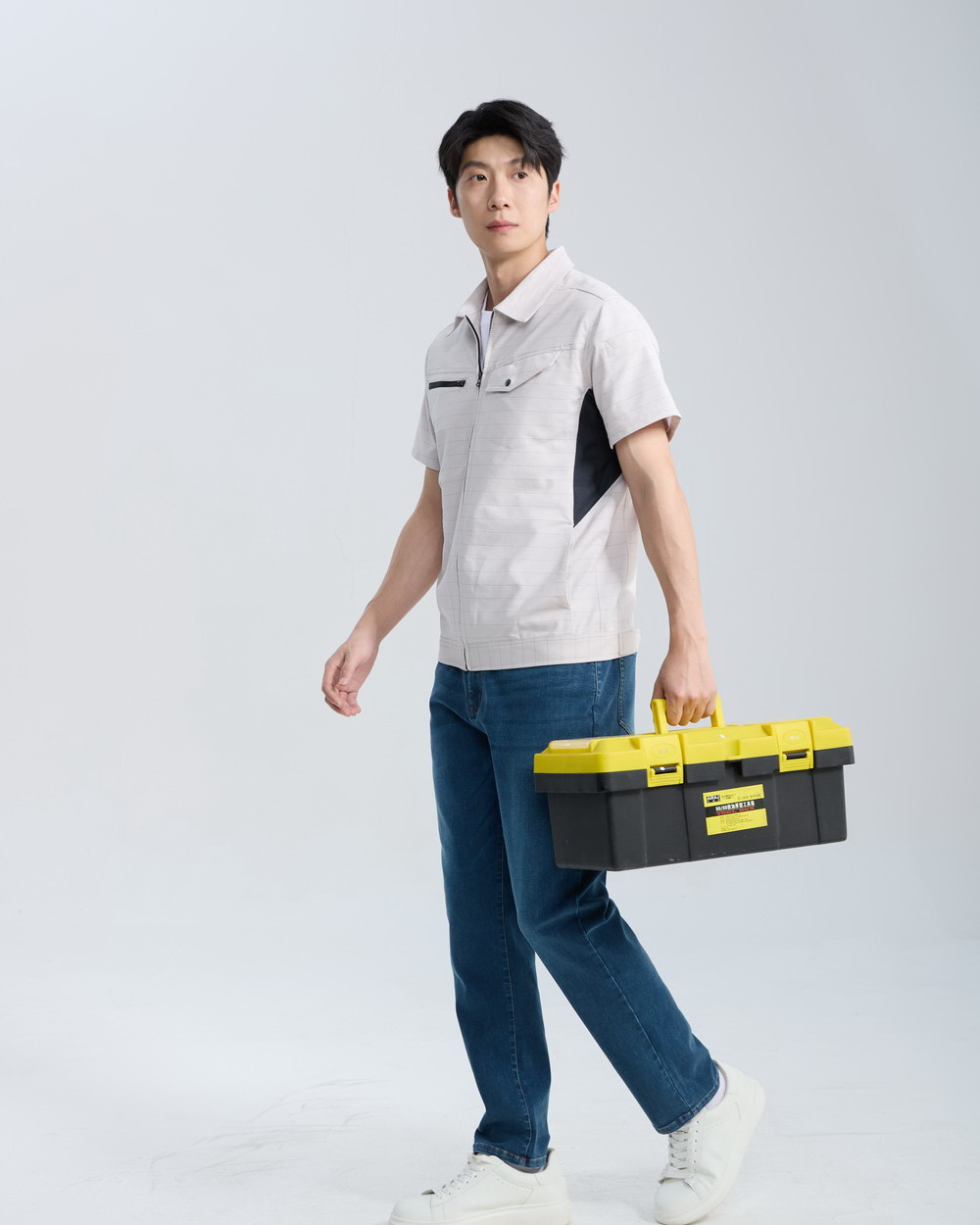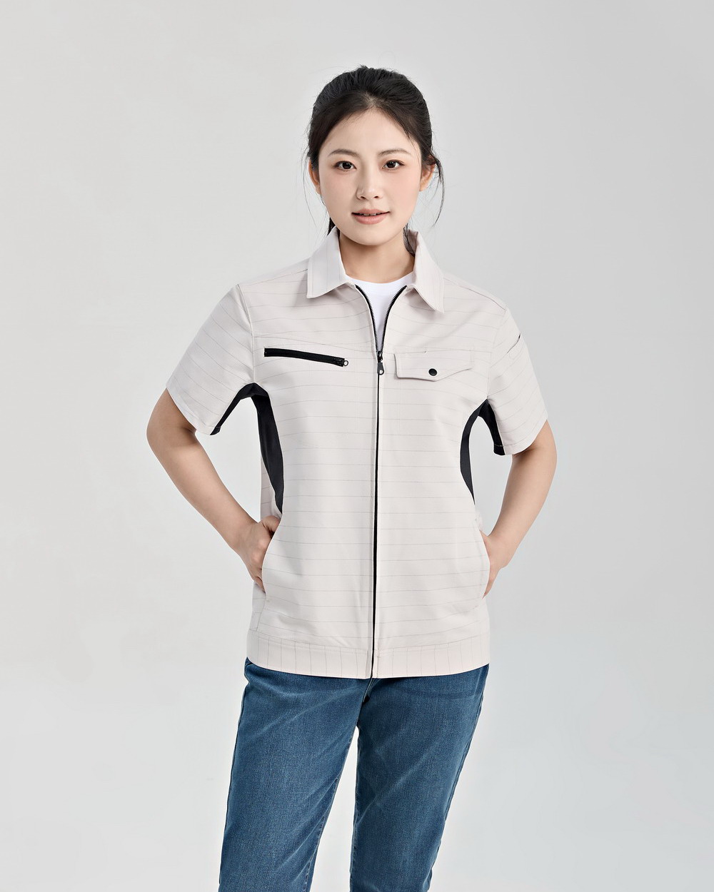 4. A zippered chest pocket and a flap pocket, a sleeve pocket for tools, underarm contrast color design